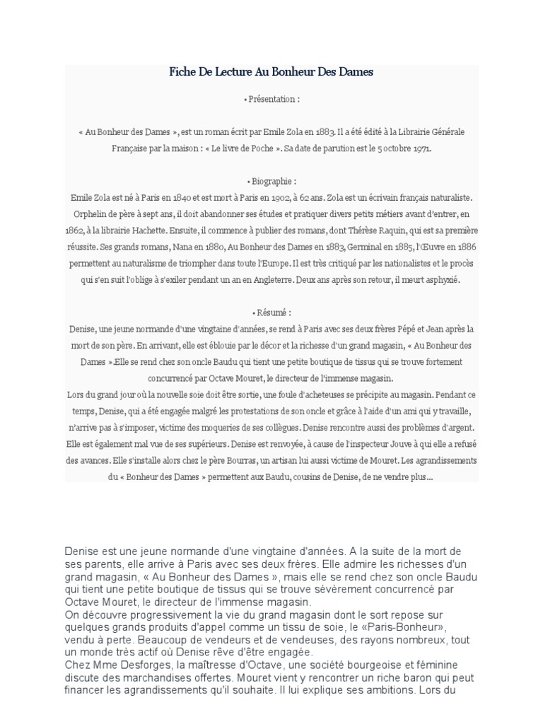 Voici un résumé détaillé du roman Au Bonheur des Dames dEmile Zola 1883. Page 1 sur 2. Le roman commence en octobre 1864 quand Denise âgée de 20 ans arrive à Paris avec ses deux jeunes frères Jean 16 ans et Pépé 5 ans dont elle est responsable depuis la mort de ses parents.
